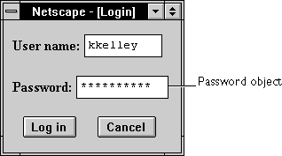 INPUT tag, with "password" as the value of the TYPE attribute. For a given form, the JavaScript runtime engine creates appropriate Password objects and puts these objects in the elements array of the corresponding Form object. You access a Password object by indexing this array. You can index the array either by number or, if supplied, by using the value of the NAME attribute.